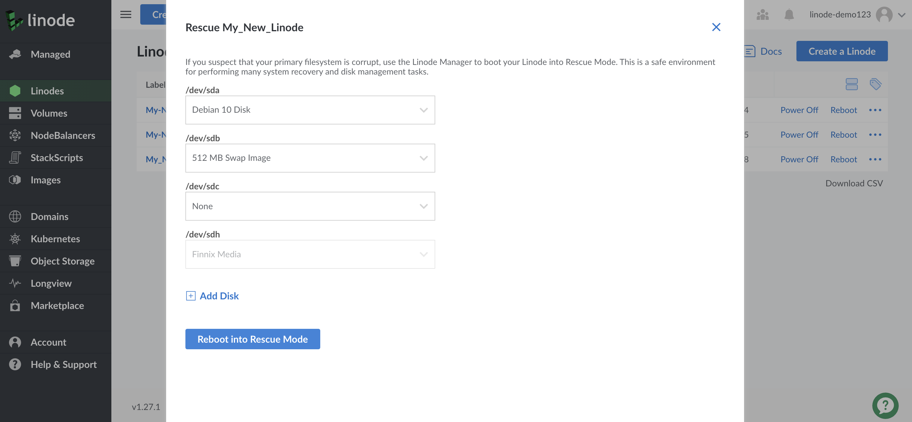 /dev/sda,/dev/sdb, etc.) and match those names to the device assignments you specify in the Rescue form before starting Rescue Mode.Matching these names is especially important if you need to change root within Rescue Mode. The chroot will be able to read your Compute Instance’s